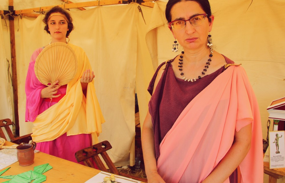 „Terra Dacica Aeterna a reconstituit o parte din piesele pe care femeile, de regulă cele bogate, le foloseau pentru a se aranja – de la ace de păr din os sau corn, la pensule, oglindă, piaptăn şi recipiente din sticlă în care se ţineau parfumurile sau prafurile pentru machiat”, povesteşte Maria Szalai. Umbreluţe diafane le apără de soare şi evantaie, unele bogate, făcute din pene colorate de păun, le răcoresc.