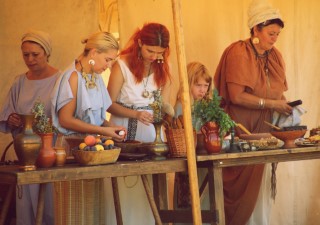 Masa este deja încărcată cu fructe, mai multe feluri de pâine, buchete de plante aromatice, iar publicul aşteaptă să deguste mâncarea după reţete antice: „Avem, în principal, mâncare romană: am făcut şi am servit prăjitura ritualică „Libum” după o reţetă de la Cato cel Bătrân, alt preparat este „in ovis apalis”, servim măsline cu miere, apreciata pastă de brânză cu condimente „moretum” şi pregătim un pui cu smântână şi salvie.