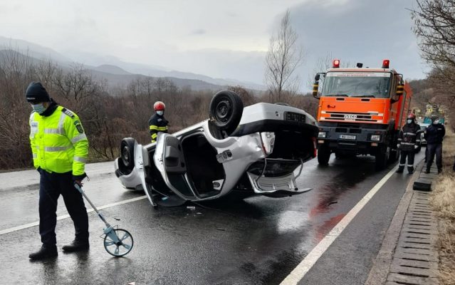 Un tânăr a pierdut controlul volanului și s-a răsturnat cu mașina pe DN66