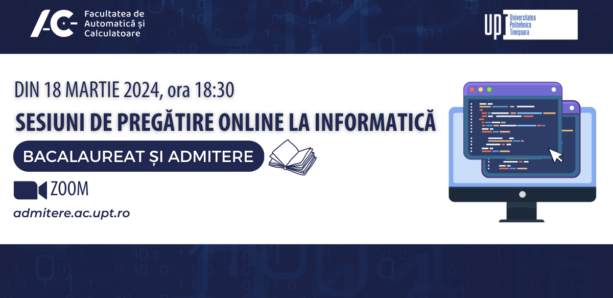 După cursurile gratuite de pregătire la matematică, la chimie și la desen, adresate elevilor și utile atât pentru examenul de bacalaureat, cât și pentru admiterea la facultate, Universitatea Politehnica Timișoara vine cu o nouă ofertă adresată liceenilor. Cursurile gratuite de pregătire la informatică organizate de Facultatea de Automatică și Calculatoare a UPT respectă programa de bacalaureat și vin în sprijinul celor care susțin examenul de admitere la facultate la această materie.