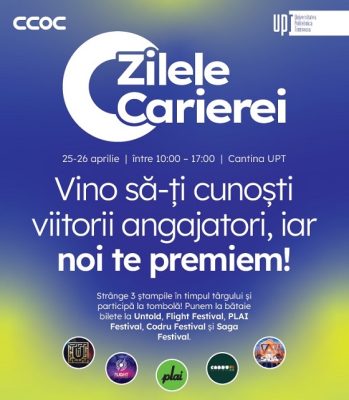 Mai multe detalii despre expozanți și eveniment se pot obține pe social media https://www.facebook.com/ZileleCariereiUPT/ sau de pe site-ul evenimentului https://www.zilelecarierei.upt.ro/