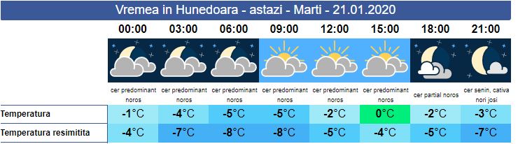 Astăzi, vremea rămâne închisă. Norii vor domina zonele joase, iar pe valea Mureșului ceața densă, însoțită de chiciură, continuă să persiste. În zonele înalte de munte, cerul e predominant senin. Valorile termice se încadrează în normalul perioadei. Minimele vor fi cuprinse între -5 și -2 grade, iar maximele vor urca spre cel mult 0 grade.