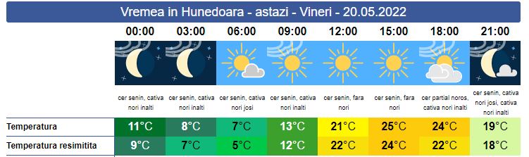 Vineri, atmosfera va fi senină. Soarele răsare la ora 05:50. În prima parte a dimineții se vor înregistra temperaturi sub 10 grade, dar se va încălzi treptat. Vântul va sufla slab la moderat. Soarele va apune la ora 20:59. Minimele se vor încadra între 7 și 12 grade, iar maximele vor urca spre 25 de grade.