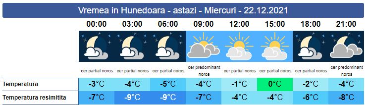 Miercuri, local vremea va fi geroasă. Soarele răsare la ora 08:04. Dimineața și noaptea vor fi condiții de polei. De asemenea, în prima parte a intervalului, în unele zone se va înregistra ceața. Cerul va fi variabil spre senin, iar vântul va sufla slab și moderat. La munte va ninge slab, iar vântul va viscoli zăpada. Soarele va apune la ora 16:48. Minima zile va coborî în jurul valorii de -5 grade, iar maxima în jurul valorii de 0 grade.