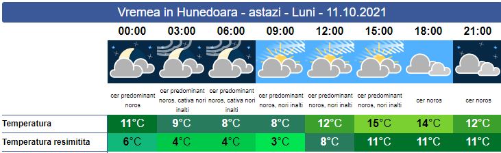 Luni, săptămâna debutează cu cer predominant noros. Soarele răsare la ora 07:37. În această noapte se vor înregistra precipitații pe arii extinse, temperaturi scăzute, iar meteorologii au emis un cod galben de intensificare a vântului, în zona de munte unde la rafală va putea depăși 100 de km/h. Peste zi, vremea va fi mai mult închisă, izolat se va produce ceața și posibil să cadă și ceva ploi. Soarele va apune la ora 18:52. Valorile minime se vor situa între 8 și 11 grade, iar maximele vor urca spre 15 grade, dar se vor resimți mai scăzute.