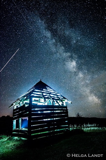 Şi tot pe Transalpina au vrut să urce în 2017 şi câţiva fotografi din Asociaţia Artiştilor Profesionişti a judeţului Hunedoara, doar că tocmai în noaptea de vârf, cerul în zonă a fost acoperit de nori, ba chiar au fost furtuni puternice. Helga Landt, împreună cu Marius Peptan şi Ioana Rusu au încercat în 13 august să fotografieze Perseidele din apropierea Măgurii Uroiului: „Duminică seara s-a văzut excelent Calea Lactee, dar atmosfera din jurul nostru a fost toxică de-a dreptul, pentru că erau în zonă nişte amatori şi de perseide şi de manele. Mai mult, stele cădeau pe cealaltă parte faţă de locul unde ne aşezasem noi. Am încercat din nou, umătoarea seară, dar am urcat în zona Ocoliş, pe Munţii Orăştiei. Marius a avut ideea să luminăm o căsuţă de lemn de acolo şi fotografiile au ieşit tare bine. Eu am prins o perseiă şi un avion, Ioana a suprins şi ea una, iar Marius a reuşit un star trails. Ne-am retras din zonă, cu tot cu aparate şi trepiede, după ce am auzit zgomote de sălbăticiune în tufişuri”, povesteşte Helga Landt. Ea spune că pentru a fotografia perseidele şi-a luat un obiectiv cât mai luminos şi trebuie să ai unghiul cât mai deschis.