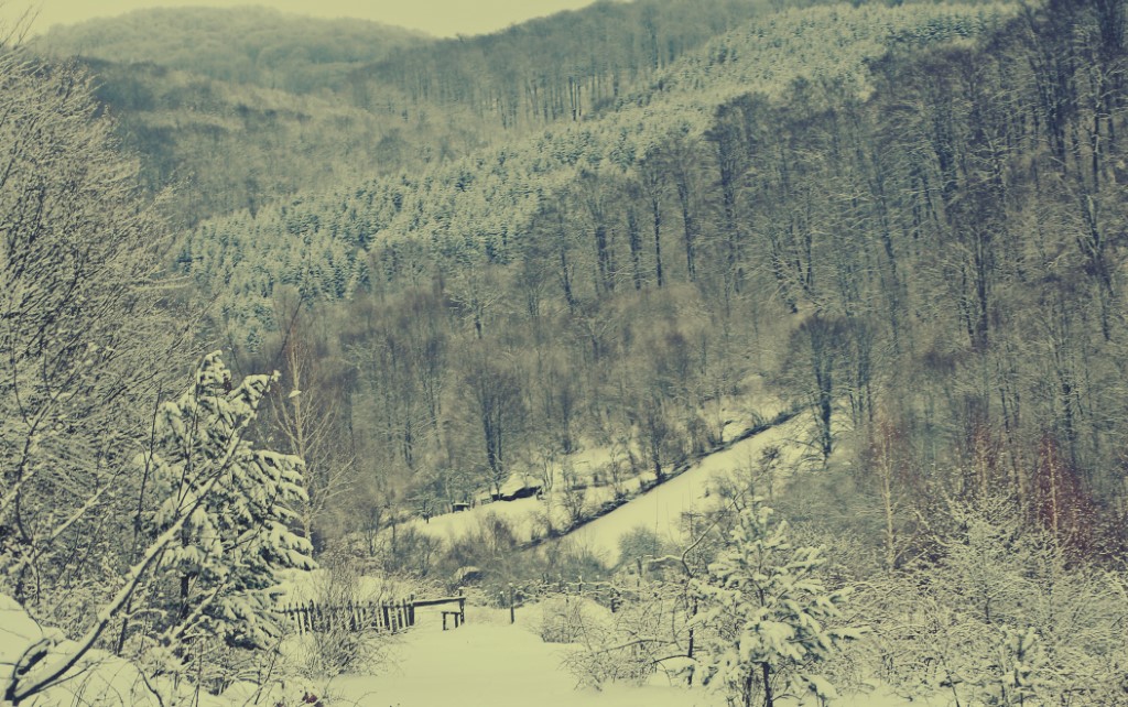 Drumul alb se strecoară prin garduri de lemn împodobite bogat cu cuşme de nea dincolo de care pământurile ţin case, clăi, prepelegi sau snopi din tulei de porumb. După ce treci de Federi, iarna se face tot mai mare şi grea, iar ţinuturile sunt împovărate cu zăpadă.