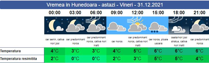 Vineri, se menține nefiresc de caldă pentru sfârșit de decembrie. Soarele răsare la ora 08:07. Izolat se va semnala ceața, iar cerul va fi predominant noros. Vântul va sufla slab la moderat cu intensificări la munte, iar spre seară sunt șanse de ploi ușoare. Soarele va apune la ora 16:55. Temperaturile sunt cuprinse între 3 și 6 grade.