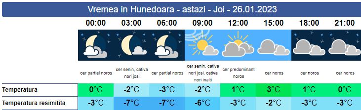 Joi, cerul va fi temporar noros. Soarele răsare la ora 07:55. Se vor înregistra temperaturi cu minus, până în prima parte a zilei, apoi vor urca ușor, până spre 3 grade cu plus. Se vor înregistra unele intensificări ale vântului mai ales în zona montană. Pe alocuri se vor forma condiții de ceață. Soarele va apune la ora 17:26. Minima va coborî în jurul valorii de -3 grade.