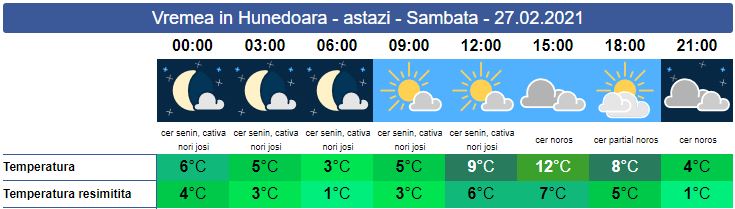 Sâmbătă, chiar dacă temperaturile scad ușor, în zona noastră vom avea o zi relativ frumoasă. Soarele răsare la ora 07:09. Cerul va fi senin, în prima parte a zile, apoi se va înnora treptat. ANM a emis o informare de intensificare a vântului, atât pentru zonele joase cât și pentru cele înalte, valabilă începând cu ora 06:00 și până luni, 1 martie a.c., la ora 12:00. Astfel, se va înregistra viteze la rafală, în general, de 45…55 km/h, iar în zona înaltă a Carpaților Meridionali se vor depăși 80…90 km/h. Soarele apune la ora 18:12. Minimele zilei se vor situa între 3 și 5 grade, iar maxima va urca spre 12 grade.
