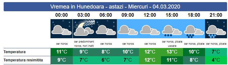 Miercuri, temperaturile se mențin peste valorile normale pentru acest început de martie, chiar dacă sunt în scădere față de ziua anterioară. Soarele răsare la ora 06:58. Vremea se menține închisă și va ploua pe arii extinse în a doua parte a zilei. Izolat, ploile vor cădea în aversă și sunt însoțite de descărcări electrice. Spre seară cantitățile de apă vor fi însemnate. La munte precipitațiile vor fi sub formă de lapoviță și ninsoare. Vântul sufla tare la munte, iar în celelalte zone, slab spre moderat. Soarele va apune la ora 18:21. Temperaturile minime vor fi cuprinse între 7-10 grade, iar maxima zilei va urca spre 13 grade.