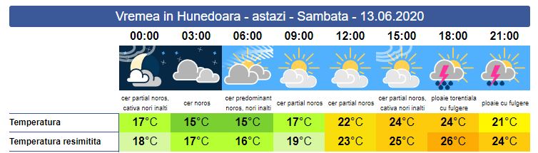 Sâmbătă, vremea se menține instabilă și umedă mai ales spre seară. Soarele răsare la ora 05:36. Peste zi, cerul va fi parțial noros. Se vor semnala precipitații, iar pe spații restrânse vor fi perioade cu averse însoțite de descărcări electrice, intensificări de scurtă durată ale vântului, grindină și posibil vijelii. Soarele apune la ora 21:20. Temperaturile minime vor cuprinse între 15 și 17 grade, iar cele maxime între 22-25 de grade.