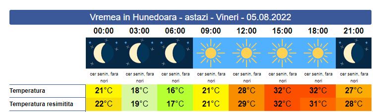 Vineri, disconfort termic local ridicat. Soarele răsare la ora 06:14. Cerul va fi complet senin, iar temperaturile vor crește accentuat după amiaza zilei. Indicele termic va depăși pragul critic de 80 de unități. Vântul va sufla slab. Soarele va apune la ora 20:54. Minimele termice se vor situa în jurul valorii de 16 grade, iar cele maxime în jurul valorii de 32 de grade.
