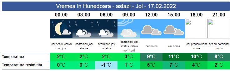 Începând cu ora 06:00 și până la ora 20:00, meteorologii au emis cod galben de vânt, în nord-vestul țării și zonele montane, inclusiv în cea mai mare parte a județul Hunedoara, dar intensificări vor fi și în restul teritoriului. Astfel că, în zonele înalte vântul va avea intensificări cu peste 70-80 km/h, iar pe creste va depăși 100 km/h, temporar va fi viscol și vizibilitate scăzută.