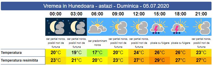 Duminică, instabilitatea atmosferică e la ordinea zilei. Soarele răsare la ora 05:43. Norii vor alterna cu razele de soare pe tot parcursul zilei, iar în cursul după-amiezii șansele de ploaie vor crește. Pe alocuri se vor semnala averse însoțite de descărcări electrice, iar vântul va sufla cu intensificări de scurtă durată. Izolat va cădea grindină. Cantitățile de apă pot depăși 20-25 l/mp, iar pe arii restrânse, chiar și 40 l/mp. Soarele apune la ora 21:22. Valoarea maximă în termometre va ajunge la 26 de grade, iar minimele se vor situa între 17 și 20 de grade.