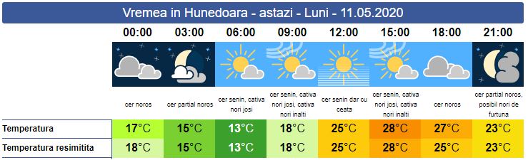 Luni, avem parte de o zi neobișnuit de caldă pentru această dată. Soarele răsare la ora 05:59. Ca aspect, cerul va fi predominant senin, iar la amiază pe locuri, posibil să se interpună un strat de ceață. Spre seară se va înnora treptat. Soarele apune la ora 20:50. Temperaturile minime se vor încadra între 13 și 18 grade, iar cele maxime între 25 și 28 de grade.