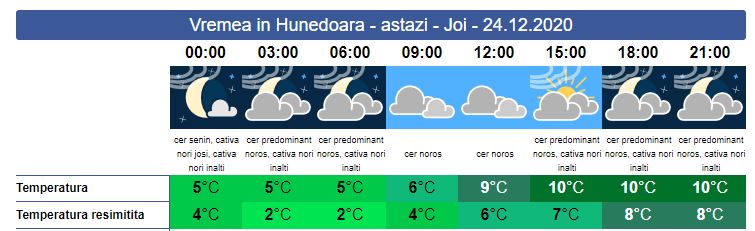 Vremea va fi închisă. Soarele răsare la ora 08:06. În zona noastră e posibil să cadă preciptații de ploaie, iar la munte va predomina lapovița și ninsoarea. Vântul va sufla în general slab, doar pe creste va avea unele intensificări. Soarele va apune la ora 16:50. Temperaturile minime se vor încadra în jurul valorii de 5 grade, iar maxima în jurul valorii de 10 grade.