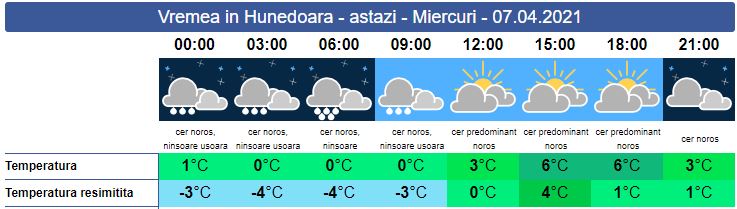 Miercuri, zi de iarnă în aprilie. Soarele răsare la ora 06:56. Din această noapte și până miercuri spre seară județul Hunedoara se află sub cod galben de ninsori și vânt puternic, în zonele de deal și munte. Temperaturile sunt deosebit de reci pentru această perioadă, în special în timpul nopții și în prima parte a zilei. La munte va ninge abundent, iar vântul va viscoli zăpada reducând considerabil vizibilitatea. Peste zi, cerul va fi mai mult noros și rece pentru această perioadă. Soarele va apune la ora 20:04. Valorile minime se vor situa între 0 și 3 grade, iar maxima zile nu va depăși 6 grade.