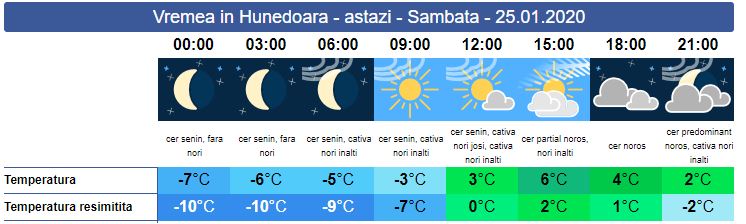 Această zi debutează cu cer senin, dar foarte frig. Ceața însoțită de chiciură se va întâlni în zonele joase. După amiază, termometrele vor înregistra temperaturi maxime de până la 6 grade, dar în atmosferă se vor resimți mult mai reci. La munte vremea e splendidă. Spre seară și în cursul nopții, norii se vor aduna, iar valorile termice vor coborî doar până la – 1 grad.