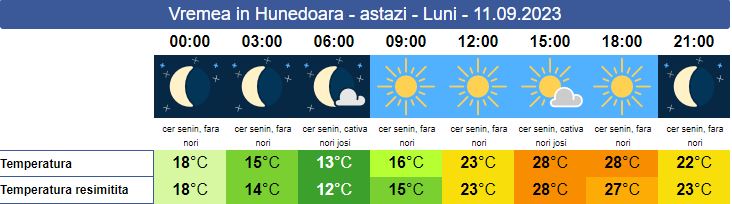 Se anunță o săptămână cu vreme, în general caldă, iar temperaturile de peste zi vor ajunge peste normalul perioadei. Atmosfera va fi mai mult senină, cu unele înnorări temporare, pe alocuri, în zonele de munte, unde nu ar fi exclus să cadă precipitații însoțite de descărcări electrice. La noapte cerul va fi mai mult senin, cu vânt cald. La munte cerul se menține variabil. Maxima zilei va urca în jur de 28-30 de grade.