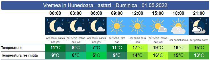 Duminică, temperaturile de peste zi se apropie de cele caracteristice perioadei. Soarele răsare la ora 06:14. În general, în zona noastră, vremea va fi plăcută, cu cer senin, iar temperaturile vor urca gradual. Spre sfârșitul intervalului norii se vor aduna, iar în cursul serii și nopții posibil să cadă averse, în deosebi la munte. Vântul va sufla slab la moderat. Soarele va apune la ora 20:36. Minimele se situează în jurul valorii de 7 grade, iar maximele în jurul valorii de 19 grade.