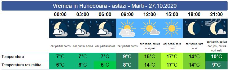 Marți, cerul va fi variabil spre senin. Soarele răsare la ora 07:00. Față de ziua precedentă, în prima parte a dimineții se va semnala ceața, temperaturile scad cu 3-4 grade, dar cele din timpul zilei vor crește ușor. În zona noastră, cerul va fi noros cu perioade de soare până spre după-amiază, când cerul se va degaja și va deveni senin. La munte vremea va fi frumoasă. Apusul se va produce la ora 17:23. Temperaturile minime se vor situa între 7 și 9 grade, iar cele maxime între 15 și 17 grade.