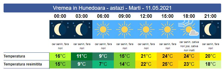 Marți, vremea frumoasă se menține. Soarele răsare la ora 06:00. Cerul va fi senin, temperaturile vor crește treptat, iar vremea va deveni deosebit de caldă pentru această perioadă. Vântul va sufla slab și moderat, în deosebi în zona înaltă a județului. Soarele va apune la ora 20:48. Temperaturile minime se vor încadra între 9 și 13 grade, iar cele maxime între 20 și 24 de grade.