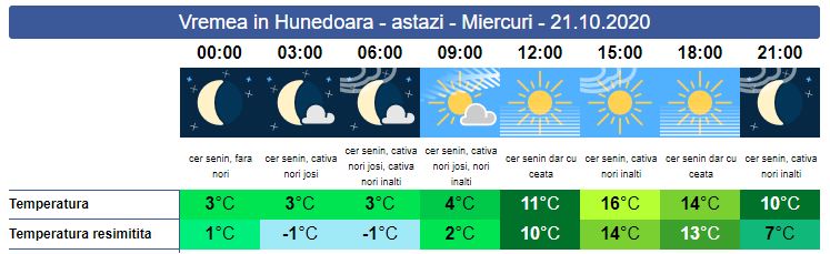 Miercuri, în general, cerul va fi mai mult senin. Soarele răsare la ora 07:52. Nu mai prezintă o noutate apariția ceții și a brumei, în primele ore ale dimineții, mai ales în zonele joase. În prima parte a zilei va fi foarte frig. Temperaturile se vor resimți sub 0 grade, dar după amiaza zile va fi mai cald cu 2-3 grade în plus față de ziua precedentă. Soarele apune la ora 18:33. Valorile minime se vor situa între 3 și 4, dar se vor resimți mai reci, iar maxima zilei va urca spre plus 16 grade.