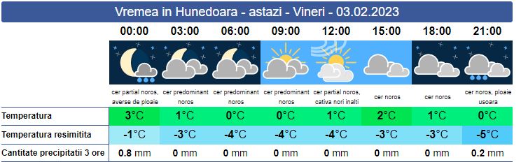 Vineri, atmosferă va fi mai mult închisă. Soarele răsare la ora 07:46. Peste noapte ploile se vor restrânge, în zonele joase, dar la altitudini se vor înregistra precipitații mixte și ninsori. Față de ziua precedentă temperaturile sunt în scădere și posibil să se întrevadă și câteva raze de soare, dar în general, norii vor domina cerul. Pe timpul serii ploile vor reveni și se vor forma condiții de polei. Vântul va sufla cu intensificări la munte. Soarele va apune la ora 17:37. Valorile termice se vor încadra între 0 și 3 grade, iar la munte în jurul valorii de -13 grade.