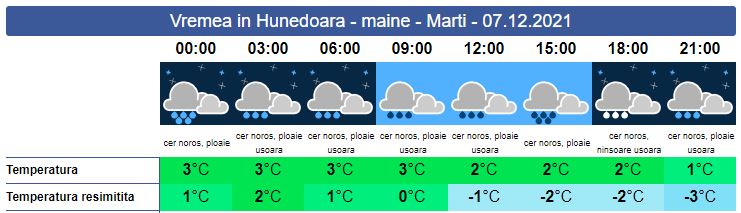 Marți, temperaturile scad la jumătate față de ziua precedentă. Soarele răsare la ora 07:53. În zonele joase și de deal se vor înregistra ploi moderat cantitativ, iar în zonele înalte și pe creste va ninge. Vântul va sufla cu intensificări și pe arii restrânse se va produce polei. Spre sfârșitul intervalului, în zonele urbane se vor înregistra ninsori ușoare. Soarele apune la ora 16:46. Valorile termice se vor încadra între 1 și 3 grade.