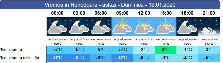 Astăzi vremea se menține închisă și umedă, din cauza ceții dense care va persista pe întreaga zi. Temperaturile rămân scăzute, mai ales în zonele joase și mai ridicate în zonele de deal și munte, unde în general cerul este senin. Posibil să fulguie pe alocuri. Valorile minime sunt cuprinse între -5 și -2 grade, dar se vor resimți și cu 3-4 grade mai puțin, iar maximele vor urca în termometre până la 0 grade.