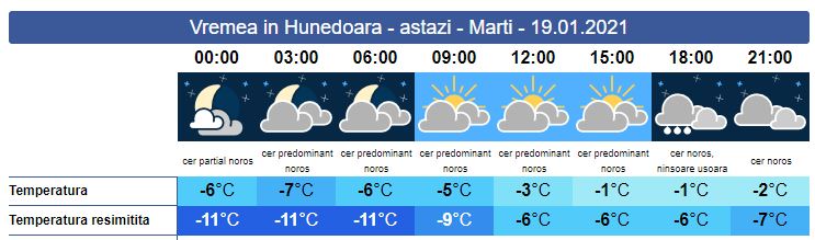 Marți, temperaturile se mențin negative pe tot parcursul zilei. Soarele răsare la ora 08:01. Peste noapte va ninge slab, în zonele joase, iar pe creste se va depune un nou strat de zăpadă. În perioada diurnă, cerul va fi predominant noros și temperaturile sunt în ușoară creștere, în timp ce spre seară pe alocuri e posibil să ningă. Vântul va sufla slab și moderat cu unele intensificări la munte. Soarele apune la ora 17:06. Valorile termice minime se vor încadra între -7 și -5 grade, iar cele maxime între -3 și -1 grad.