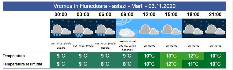 Marți, valorile termice se încadrează în normalul perioadei. Soarele răsare la ora o7:10. Pe tot parcursul zilei vremea se va menține înnorată. Soarele apune la ora 17:13 Temperaturile minime se vor situa între 9-10 grade, iar maxima zilei va ajunge spre 13 grade.