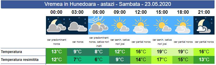Weekendul se anunță destul de rece pentru ultima decadă a lunii mai, dar față de ziua precedentă se încălzește ușor. Sâmbătă, soarele răsare la ora 05:46. În general, pe parcursul zilei, cerul va fi însorit, cu înnorări temporare. Vântul va sufla slab spre moderat, doar în zona montană va avea unele intensificări. Soarele apune la ora 21:03. Temperaturile maxime ale zilei nu vor depăși 19 grade, iar minima zilei va fi în jurul valorii de 9 grade.