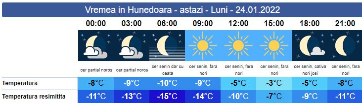 Luni, cerul va fi senin. Soarele răsare la ora 07:57. Noaptea și dimineața temperaturile se vor resimți geroase, iar local se va semnala ceața și depunere de chiciură. Vântul va sufla slab și moderat cu intensificări la munte, unde ninsorile vor fi viscolite. Soarele va apune la ora 17:23. Temperaturile minime vor fi cuprinse între -10 și 8 grade, iar maximele între -3 și -5 grade.