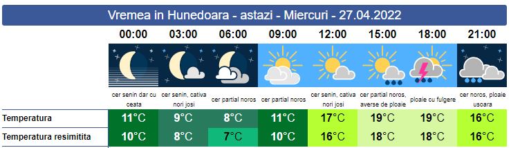 Miercuri, atmosfera va fi schimbătoare cu cer variabil. Soarele răsare la ora 06:51. Începând de la mijlocul acestei nopți, cerul se va înnora, iar în spre a doua parte a zilei se anunță intensificări ale vântului, ploi însoțite de descărcări electrice și căderi de grindină. Soarele va apune la ora 20:01. Minimele zilei se vor situa între 8 și 11 grade, iar cele maxime vor urca spre 20 de grade.