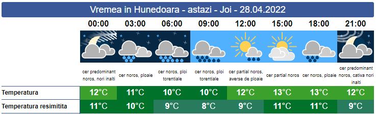 Joi, atmosfera va fi instabilă. Soarele răsare la ora 06:19. Pe perioada nopții va ploua semnificativ, iar sporadic vor fi însoțite de descărcări electrice. La munte precipitațiile pot fi mixte. De asemenea, meteorologii au emis cod Galben de instabilitate atmosferică temporar accentuată, în majoritatea regiunilor unde se vor înregistra cantități însemnate de apă, vijelii și grindină, valabil până spre seară. În timpul zilei, în zona noastră, ploile vor persista, cerul va fi noros și parțial noros, iar spre seară precipitațiile vor reveni. Soarele va apune la ora 20:32. Temperaturile se vor situa între 10 și 13 grade.