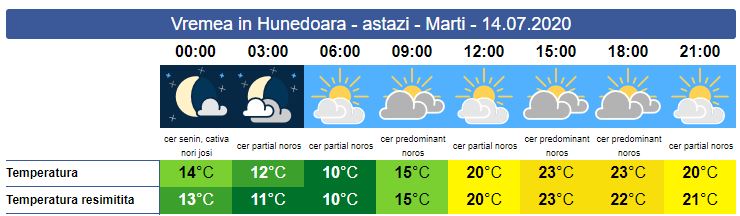 Marți, temperatura maximă crește ușor față de ziua precedentă. Soarele răsare la ora 05:51. La primele ore ale dimineții vremea este deosebit de rece pentru această perioadă. Peste zi, cerul va fi variabil cu înnorări temporare. Vântul va bate de la slab spre moderat, doar la munte va avea unele intensificări. Soarele apune la ora 21:17. Minima zilei se va situa între 10 și 15 grade C, iar cea maximă în jurul valorii de 23 de grade C.