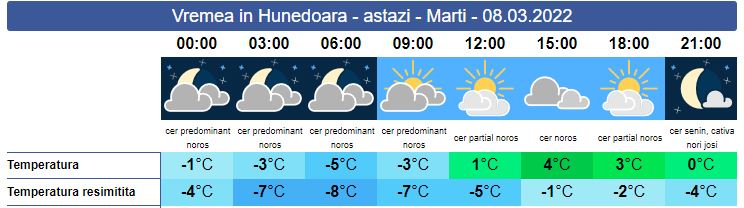 Marți, cerul va fi predominant noros, iar temperaturile vor scădea. Soarele răsare la ora 06:53. La munte se vor înregistra ninsori, iar în restul teritoriului există probabilitatea ca pe alocuri să cadă precipitații mixte. Vântul va sufla slab și moderat, cu ușoare intensificări în zonele înalte. Soarele va apune la ora 18:45. Minimele zilei vor coborî sub -3 grade, iar cele maxime se vor situa în jur de 5 grade.