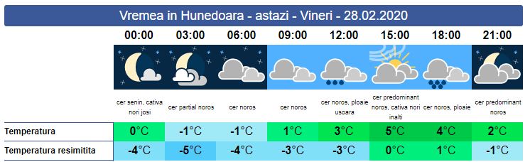 Vineri, cerul va prezenta înnorări, iar în jurul amiezii se vor înregistra precipitații și pe arii restrânse va cădea lapoviță. Soarele va răsări la ora 07:07. Vântul va sufla moderat, cu intensificări la munte, unde se vor înregistrează și ninsori viscolite. Spre seară ploile se vor intensifica. Soarele va apune la ora 18:14. Temperaturile minime se vor înregistra între -1 și 2 grade, iar maximele nu vor depăși 5 grade.