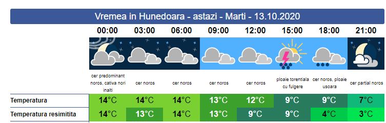 Marți, soarele răsare la ora 07:41. Vor fi intensificări ale vântului, unde la rafală va putea atinge viteze de peste 50km/h. Va ploua zgomotos, iar cantitățile de apă pot depăși 35 l/mp. Soarele apune la ora 18:47. Valorile minime și maxime vor fi constate, situând-se între 12 și 14 grade, până în a doua parte a zilei când vor începe să scadă. După apusul soarelui, care se va produce la ora 18:45, valorile termice vor scădea accentuat resimțindu-se între 3 și 4 grade.
