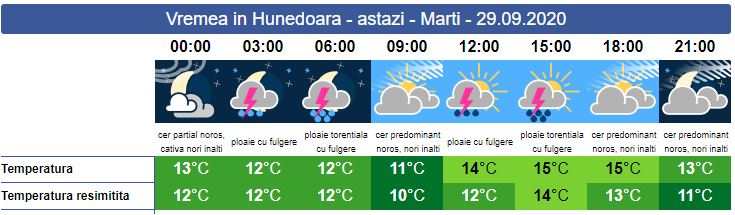 Marți, temperaturile scad. Soarele răsare la ora 07:24. Până spre sfârșitul zilei, vor cădea ploi însemnate cantitativ. Vântul va sufla cu unele intensificări. La munte vor cădea precipitații mixte. Soarele apune la ora 19:13. Temperaturile minime se vor încadra între 10 și 13 grade, iar cele maxime între 13 și 15 grade.