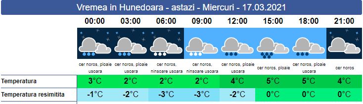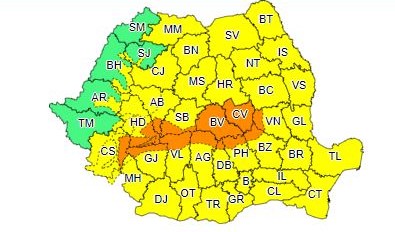 Miercuri, în județul nostru sunt activate două coduri de vreme rea, valabile până joi. Soarele răsare la ora 06:38. Va ploua toată noaptea, iar spre dimineață se vor înregistra ninsori, care treptat se vor transforma în ploi abundente. În zona montană va continua să ningă, iar stratul de zăpadă va crește considerabil. Vântul va sufla cu unele intensificări, în timp ce la munte va viscoli și troieni zăpada. Soarele apune la ora 18:37.