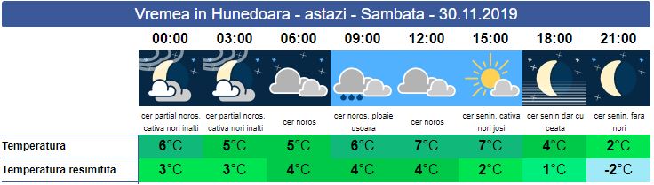 Astăzi vremea este mai rece față de ziua de ieri. După orele amiezii, spre după-amiază este posibil să iasă și soarele. Vântul suflă slab spre moderat, dar accentuat și în rafale, în zonele montane. Spre seară cerul va fi senin și se va instaura ceața. Temperaturile maxime nu vor depăși 7 grade în termometre, dar din cauza vântului se vor resimți cu 3-4 grade mai scăzute