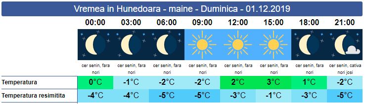 Ziua de duminică, 1 Decembrie va debuta cu valori negative, dar sub soarele care va fi prezent toată ziua. Pe la orele amiezii, deși soarele va încălzi puțin atmosfera, temperaturile resimțite vor fi tot cu minus. Valorile minime se vor încadra între -3 și -5 grade, iar cele maxime nu vor urca mai mult de 3 grade.