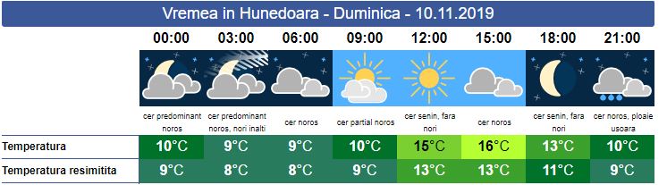 Pentru ziua de sâmbătă, încă din timpul nopții, norii se vor risipi, iar cerul se va însenina. În zonele depresionale, fenomenul de ceață va fi prezent. Pe tot timpul zilei soarele va sta pe cer, iar temperaturile vor fi în ușoară creștere. Valorile minime se vor încadra între 8 și 11 grade, iar maximele vor urca până la 17 grade.