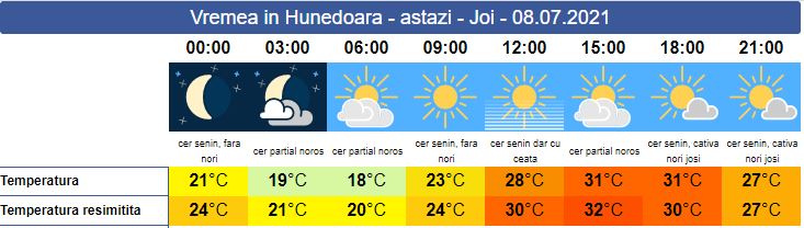 Joi, cerul va fi variabil. Soarele răsare la ora 5:45. Chiar dacă se vor strânge și câțiva nori, în continuare disconfortul termic va fi accentuat. Conform ANM, codul galben de caniculă va fi valabil atât astăzi, cât și vineri. Soarele va apune la ora 21:21. Temperaturile minime se vor situa între 18și 21 de grade, iar cele maxime se vor situa în jurul valorii de 31 de grade.