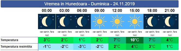 Duminică va fi o zi senină. Soarele va străluci în toată splendoarea. Temperaturile vor crește cu un grad față de ziua de sâmbătă. Se vor produce condiții de ceață densă. Noaptea va fi senin, dar rece, cu valori negative. Valorile maxime se vor încadra între 7-10 grade, iar cele minime între -2 și 2 grade.