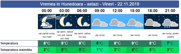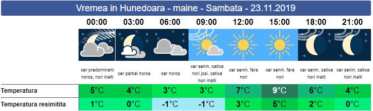 Sâmbătă, cerul va fi însorit pe tot parcursul zilei. Valorile termice nu suferă modificări însemnate. Noaptea posibil să își facă apariția temperaturi de sub zero grade. La munte vântul va sufla în rafale. Temperaturile maxime se vor încadra între 7 și 9 grade.