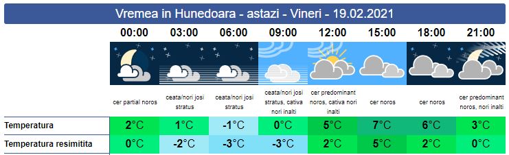 Vineri, cerul va fi mai mult noros. Soarele răsare la ora 07:23. Dimineața, în zonele joase se va înregistra ceață. Vremea se încălzește peste normalul perioadei. La munte, pe creste va ninge. Vântul va sufla slab spre moderat. Soarele apune la ora 18:31. Temperaturile minime se vor situa între -1 și 3 grade, iar cele maxime între 5 și 7 grade.